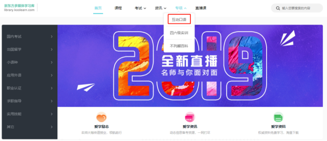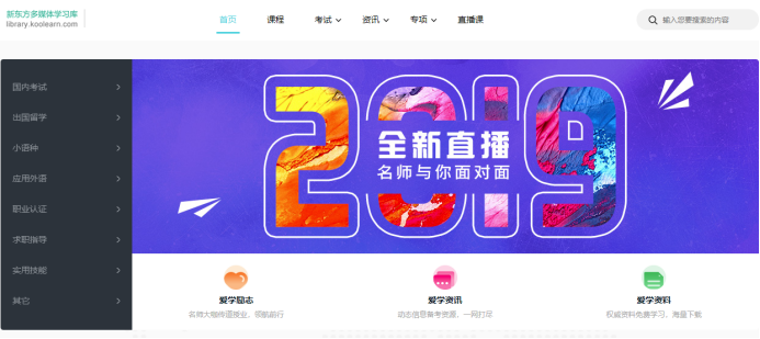 新东方在线多媒体学习库(library.koolearn.com)是由新东方在线推出的“一站式”学习平台,这里专为广大师生提供丰富、优质的新东方原汁原味培训课程,让广大师生能够尽享新东方激情、幽默的教学风格,获得卓越的在线互动式学习体验,是广大师生考试、出国、充电、求职的首选学习资源。