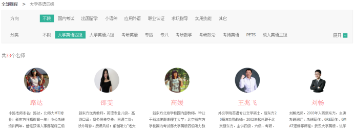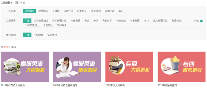 大学英语四级、大学英语六级、专四专八、考研英语、考研数学、考研政治、考博英语、PETS、成人英语三级、英语AB级、工商管理硕士、专业硕士、职称英语、托福、雅思、GRE、GMAT、日语、韩语、法语、德语、西班牙语、意大利语、俄语、商务英语、口译、实用英语、基础英语、新概念、医学、司法、金融、公务员、求职指导、实用技能等。