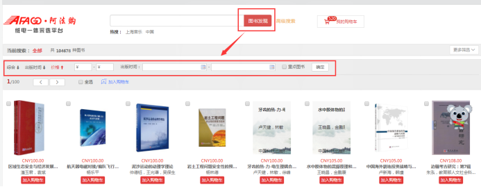 需要的图书直接加入购物车即可。系统还可根据图书的综合评分、出版时间、定价排序。也可按价格区间、出版时间段、重点图书进行筛选。