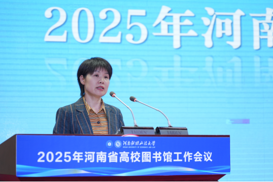 陈晓景在致辞时代表河南财经政法大学向与会的各位嘉宾表示热烈欢迎,并介绍了学校基本情况和图书馆建设情况。她指出,本次会议以数智赋能高校图书馆新一轮高质量发展为主题,深入研讨AI背景下事关图书馆发展的关键共性问题,必将有力促进高校图书馆高质量发展。同时她希望省高校图工委领导继续关心支持我校图书馆工作,与会专家学者多为图书馆发展提出宝贵意见,共同助推书香社会建设,并预祝大会圆满成功。