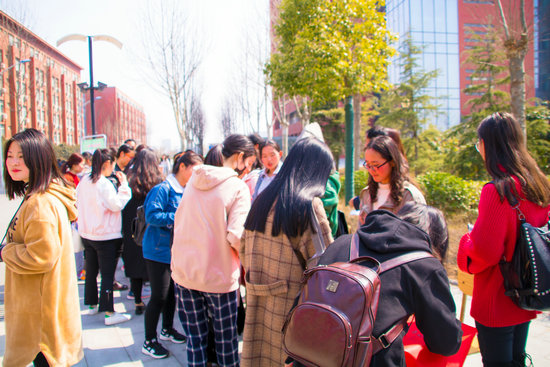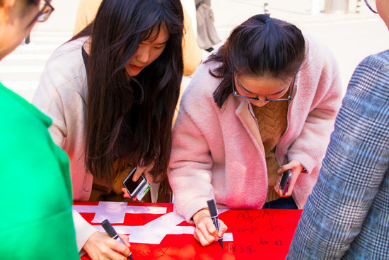 上午11:00,全体工作人员及图书馆部分学生管理员在校餐厅的对面又布置了签名台。路过的师生纷纷驻足观看,并积极签名表达他们对此次活动的认同。短短一个小时,签名条幅上已经密密麻麻写满了师生们的名字和祝福。