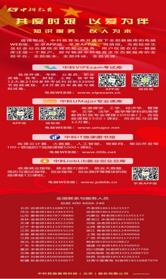 在搜集汇编时,我们了解到以上部分资源是在疫情期间免费开通使用的,具有一定的时效性,如出现使用权限到期或是其他问题给您带来不便的敬请谅解!如有其它需要或疑问可联系图书馆办公室安优佳老师,联系电话:17630009859。
