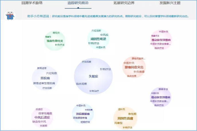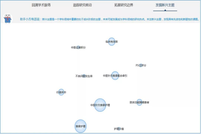 图中,每个前沿主题由一个气泡内的一组关键词组成,这一组关键词共同表达一个前沿主题。点击气泡,即可在气泡图右侧查看相关这个前沿主题相关的核心文献。