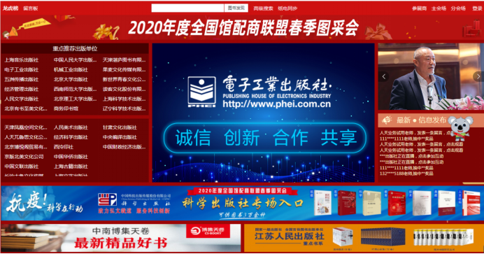 4.1、主会场:右上角展示相关人员讲话及平台消息发布。其他板块主要展示重点出版社书目,直接点击出版社名称即可进入选书界面。