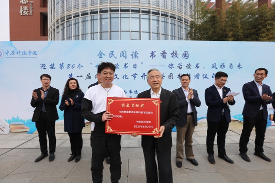 为迎接第26个“世界读书日”,献礼建党一百周年,推动全民阅读,共建书香校园,倡导“图书重复循环利用,实现资源共建共享”理念,营造浓厚文化氛围,4月23日,我校在图书馆前举行了中原科技学院第一届阅读文化节开幕暨图书捐赠仪式,校长仉建涛、副校长段其旺、副校长李淮嵩、校长助理杜建松、校长助理左丽娟、图书馆馆长、副馆长及全校3000余名师生参加开幕及捐赠仪式。