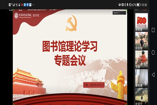 2022年10月27日上午,图书馆在线上召开了专题学习会议,会议学习研讨习近平总书记代表十九届中央委员会在党的第二十次全国代表大会上所作的工作报告等内容,此次理论学习活动由图书馆党小组成员王辰同志主持,图书馆郑州校区、许昌校区全体成员参加。