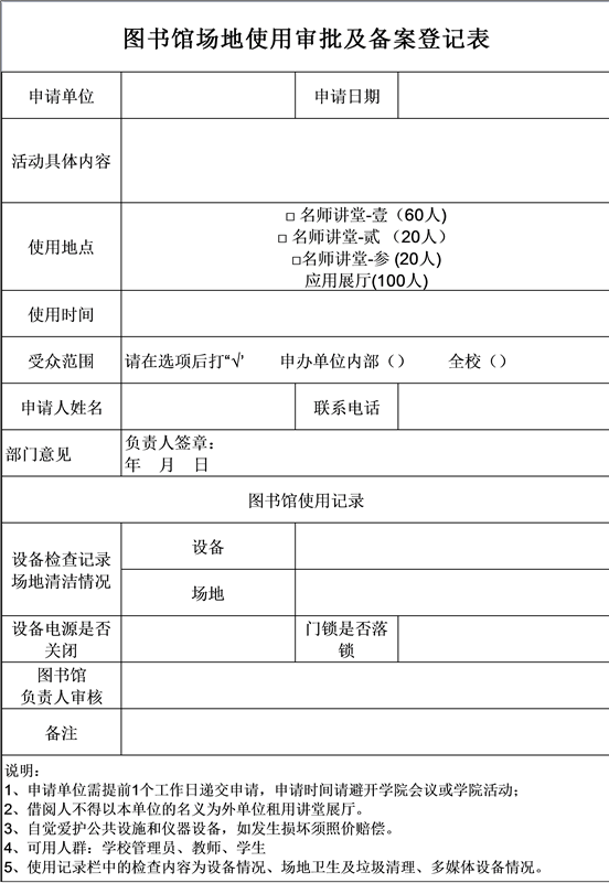 一、使用图书馆作为活动场地之前必须严格执行图书馆的活动审批流程和登记备案制度,填写《图书馆场地使用审批及备案登记表》(附件1),并签字盖章。由图书馆对举办会议、讲座、活动等内容进行审查,经审查,内容不涉及到意识形态领域问题的,方可使用图书馆公共空间。