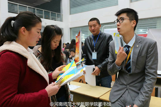 双选会现场近日,河南师范大学新联学院2017届毕业生双向选择洽谈会在我院图书馆大厅落下帷幕。据相关负责人指出,本次双选会共有203家单位参会,为2017届三千多名毕业生提供岗位8268个。参与本次双选会的多为民办型企业,主要包括教育、销售和IT等行业。在双选会现场,毕